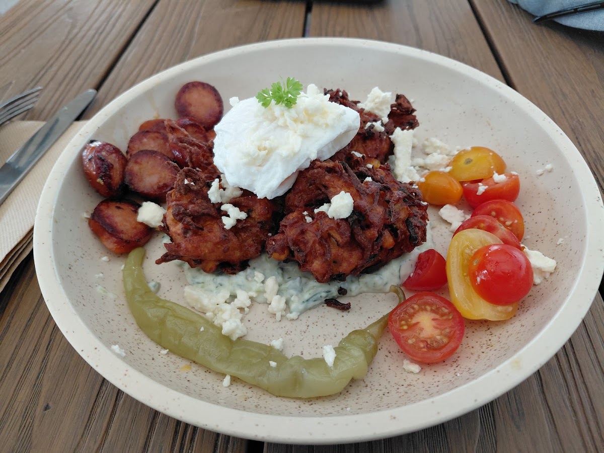 Nice Corn and Zucchini Fritters breakfast , great location near the beach ... very noisy with multiple Lycra clothed old people talking .